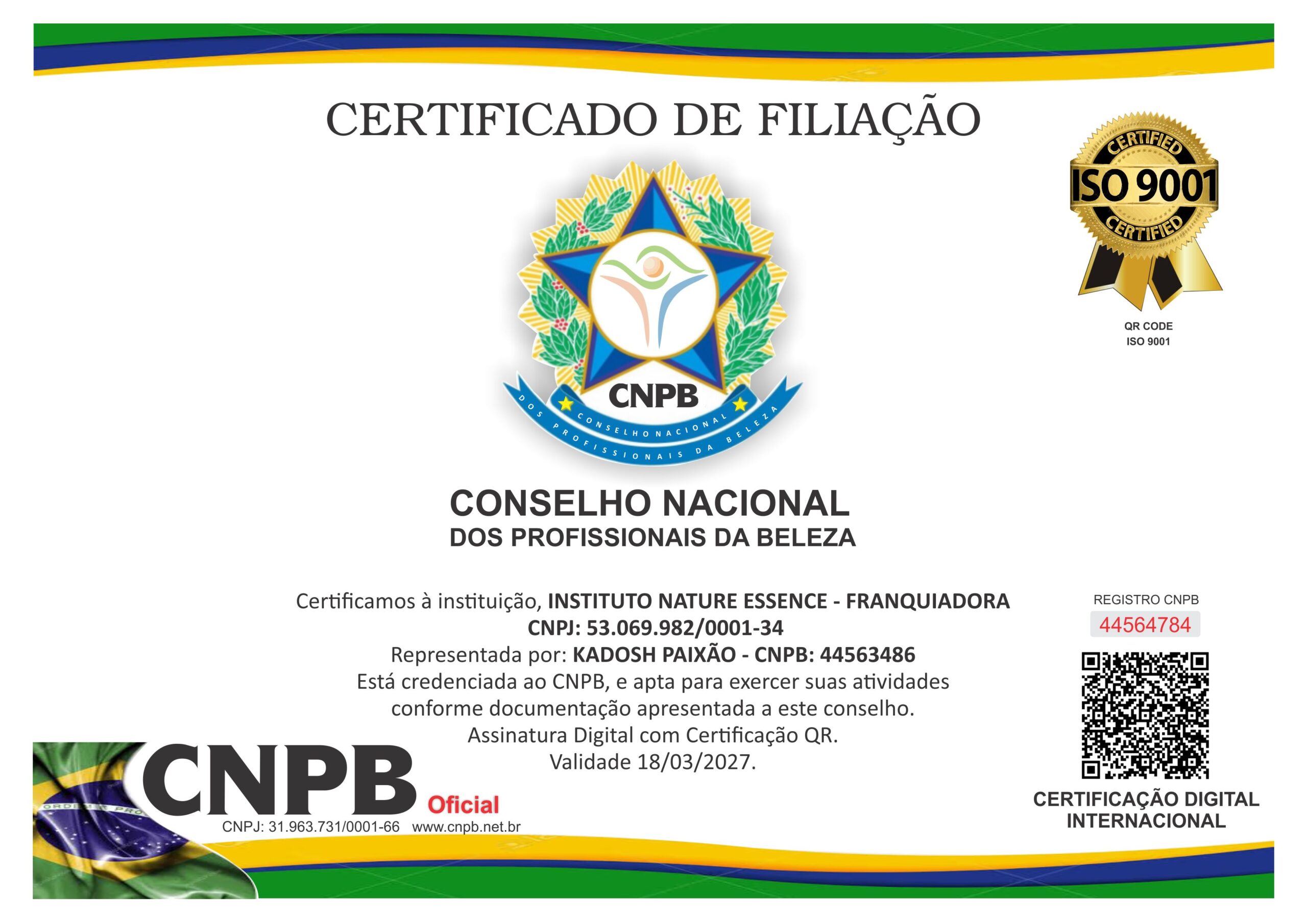 Certificamos à instituição, INSTITUTO NATURE ESSENCE – FRANQUIADORA