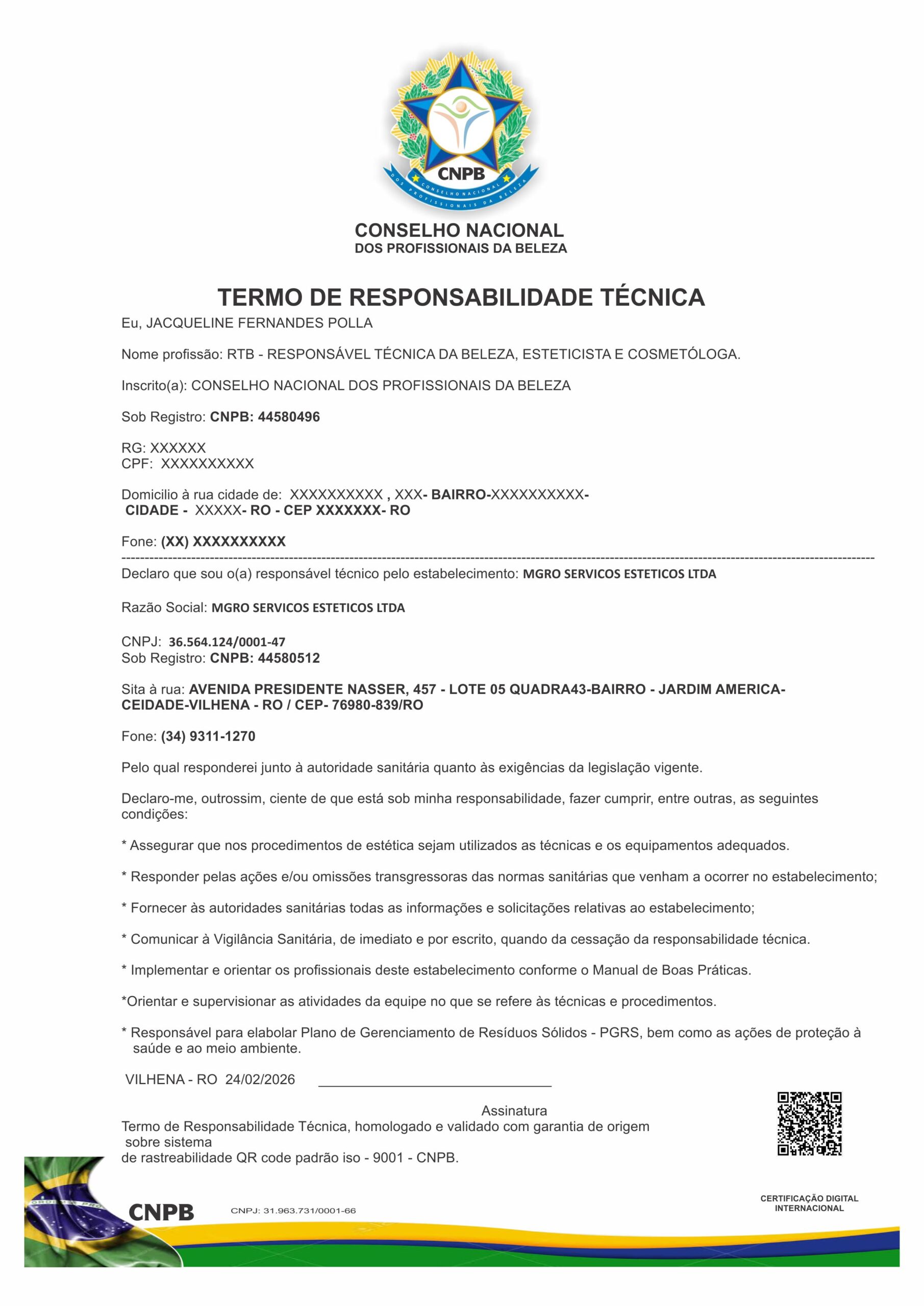 Declaro que sou o(a) responsável técnico pelo estabelecimento: MGRO SERVICOS ESTETICOS LTDA