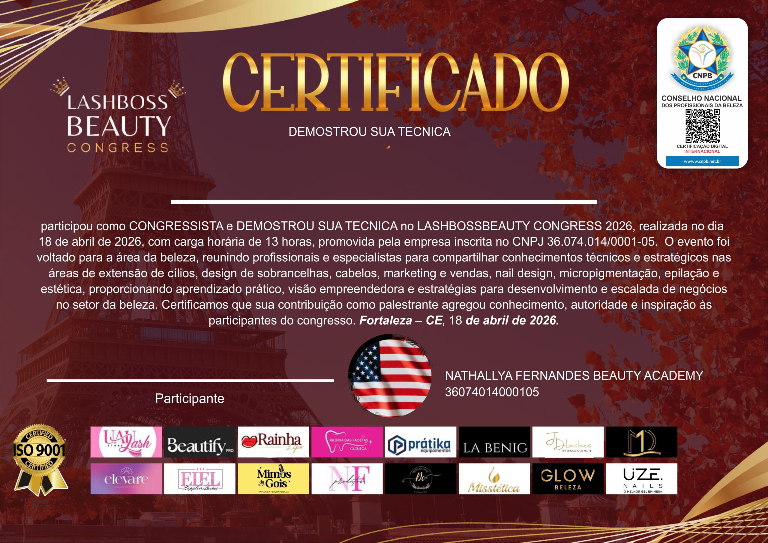 Evento LASH BOSS BEAUTY CONGRESS 2026, realizada no dia 18 de ABRIL, com carga horária de 13 horas, promovida pela empresa CNPJ 36.074.014/0001-05. O evento foi voltado para a área da beleza, abordando conteúdos como extensão de cílios, design de sobrancelhas, cabelos ,marketing e vendas,nail, micropigmentacao , epilaçao,cabelo, estética,proporcionando aprendizado prático e estratégico para o desenvolvimento e escalada de negócios no setor. Lash Boss Beauty Congress, reconhecido por sua excelência na capEvento