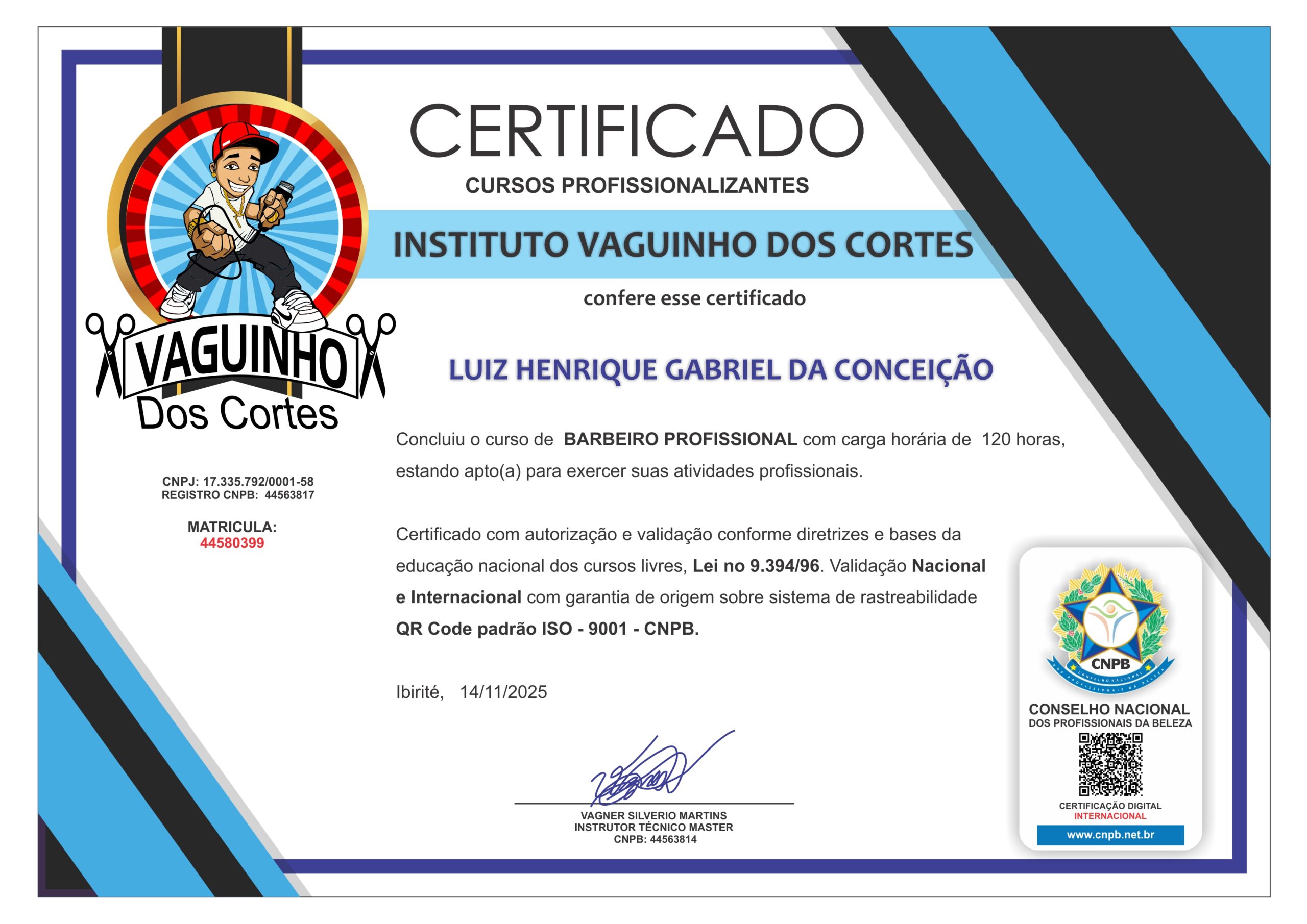 CONCLUIU O CURSO DE BARBEIRO PROFISSIONAL COM CARGA HORÁRIA DE 120HORAS, ESTANDO APTO(A) PARA EXERCER SUAS ATIVIDADES PROFISSIONAIS.